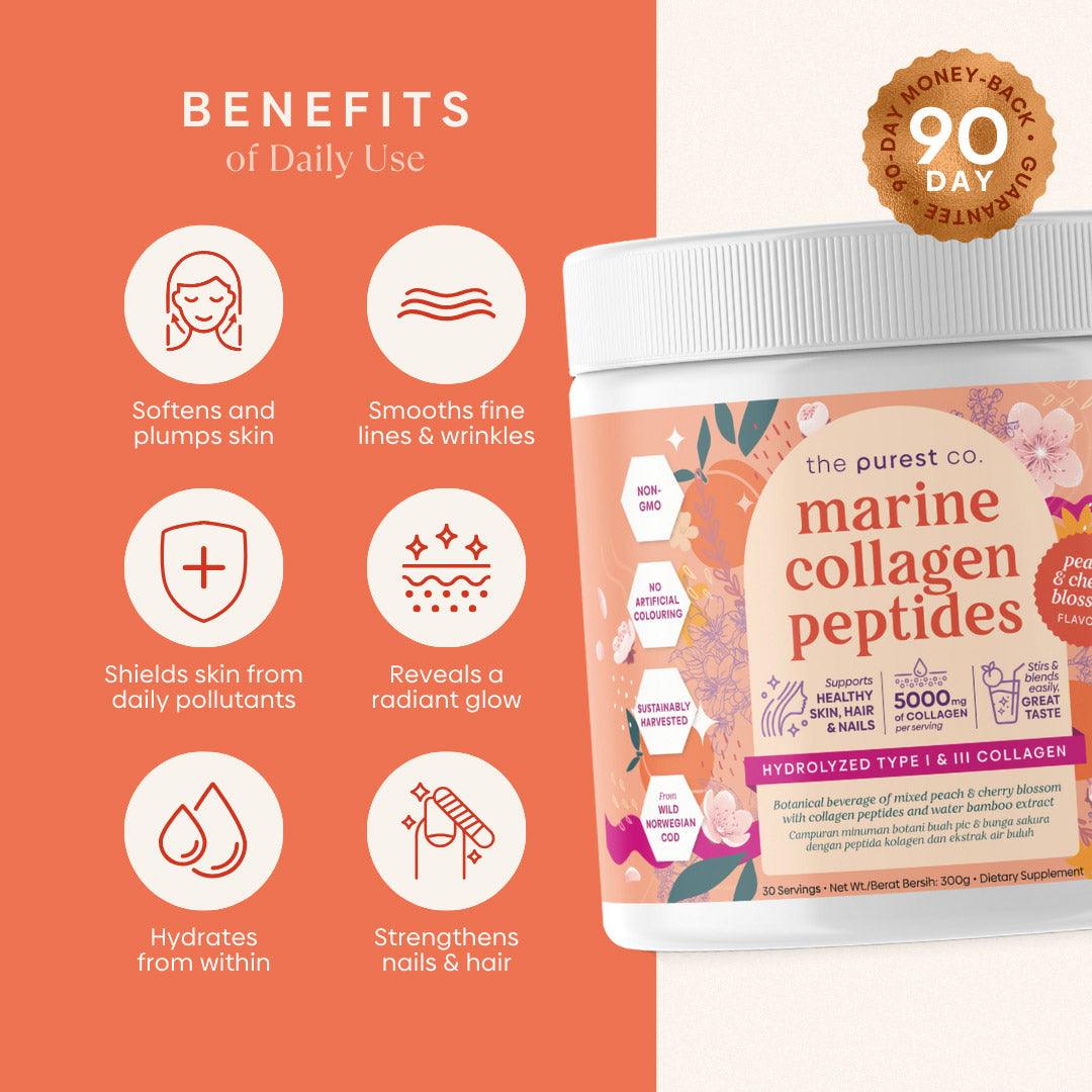 Savor the fusion of Peach and Cherry Blossom with Marine Collagen Peptides by The Purest Co. Get ready for the same collagen goodness, the same delicious taste, but with a wallet-friendly twist. A splash of fun in your daily routine that does not just light up your skin, but your budget too. Now, who says affordable can't be fun and tasty?
